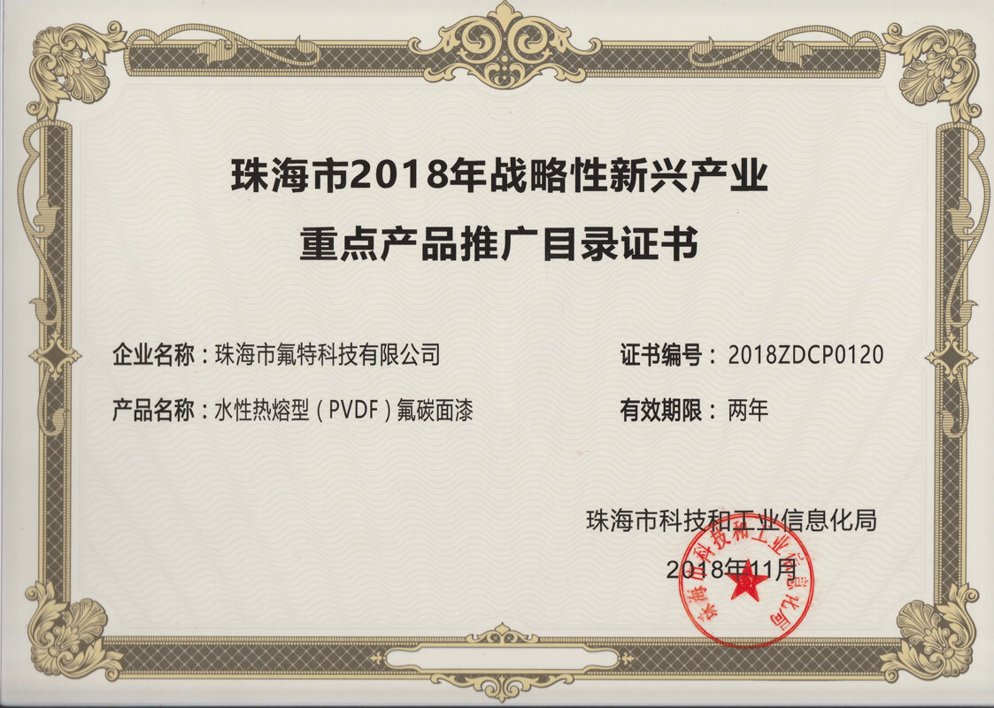 珠海市2018年战略性新兴产业重点产品推广目录证书