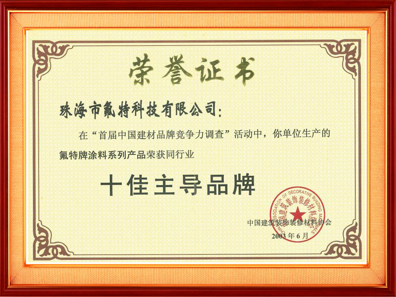 十佳主导品牌荣誉证书
