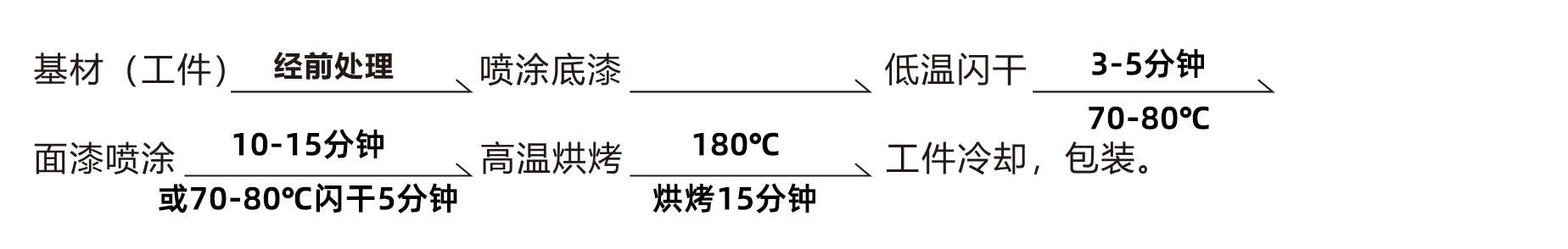 1、 上述工艺为“两涂一烘”工艺,干膜状态下,底漆膜厚控制在8-10um,面漆膜厚为15-20um,总膜厚为25-30um。客户也可根据应用需要,直接采用免底漆的单涂工艺,但需要测试面漆在基材上的附着力水平,推荐单涂层厚度为15-20um。