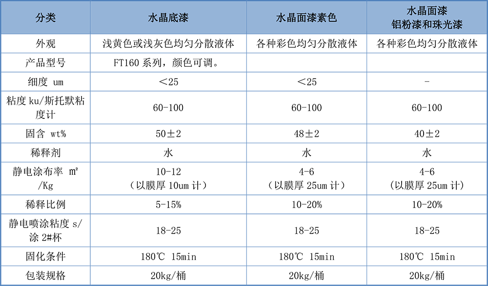 FT160水晶涂料为珠海市氟特科技有限公司研发的新一代水性绿色环保型涂料产品,采用高性能的水性丙烯酸树脂或聚酯树脂作为主体成膜物质,辅以各种光彩艳丽的着色颜料以及晶莹闪烁的效应颜料,漆膜经过180℃高温固化以后,可以在基材上形成质感饱满、光彩亮丽的保护涂层。该类型产品主要应用于铝合金、五金零部件、不锈钢、铝型材等基材的涂装,赋予基材极佳的性能防护和外观装饰效果。与溶剂型涂料相比,FT160水晶涂料在生产和使用过程中可直接用水作为分散介质,彻底克服了传统溶剂型涂料对苯、甲苯、乙酸乙酯、异氟尔酮等有毒强刺激性有机溶剂的依赖,同时也是目前市场上流行的“水溶性丙烯酸涂料-晶泳漆”的完美取代品,具有优异的施工性能及耐化学品性能。