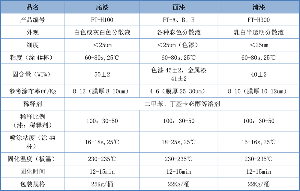 该系列氟碳涂料(FT-A/B/H)包括底漆、面漆、清漆、稀释剂等。根据面漆的颜色、光泽、所用颜料以及使用要求不同,可提供使用清漆的三层涂装和不使用清漆的二层涂装,颜色详见色卡。