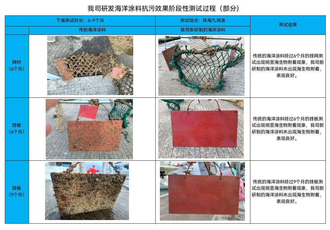 将我司自主研发的海洋生物环保涂料和普通海洋防污涂料分别制备成样板以后,同时浸泡在自然环境下的海洋水体中,我司产品样板经过6个月至36个月实验无藻类生长附着现象,普通类海洋防污涂料已经出现明显生物附着现象。